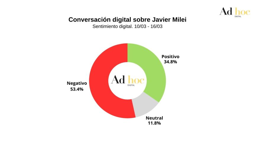 El impacto no es solo cuantitativo. El mismo informe refleja un deterioro en el clima digital: un 53,4% de las menciones hacia el Presidente son negativas, frente a un 34,8% positivas. Días atrás, el pico de conversación sobre Adorni ya había mostrado un 76,5% de negatividad, anticipando un escenario adverso que ahora se profundiza.