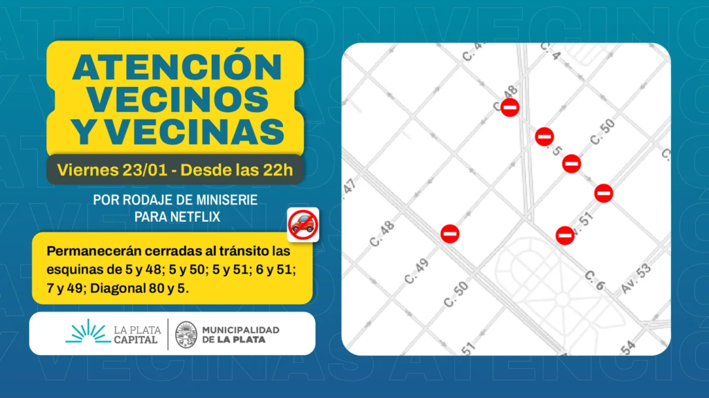 El centro de La Plata atraviesa desde este fin de semana importantes cortes de tránsito debido al rodaje de una serie para la plataforma Netflix, una producción que obliga a modificar la circulación en varias arterias clave del casco urbano y que se extenderá por etapas hasta los primeros días de febrero.
