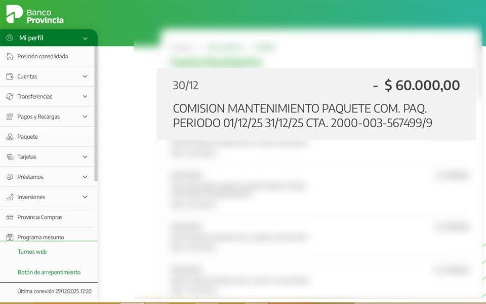 El inconveniente comenzó a visibilizarse entre la noche del martes 30 de diciembre y la jornada siguiente, cuando clientes advirtieron descuentos bajo el concepto “Comisión Mantenimiento Paquete”. Los montos no pasaron desapercibidos: en varios casos rondaron los $60.000 y llegaron incluso a superar los $80.000, lo que disparó quejas masivas, principalmente en redes sociales.