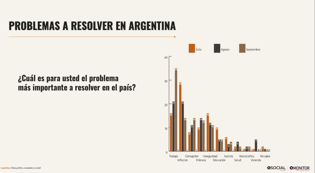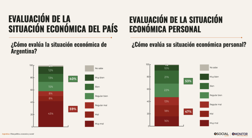 La percepción sobre la situación económica también refleja el malestar social: el 59% de los consultados la califica como negativa, y más de la mitad considera que la situación empeoró en los últimos dos años.