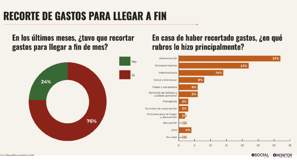 Ante este panorama, los recortes de gastos se concentran en áreas sensibles: alimentos (32%), entretenimiento (22%) e indumentaria (14%).