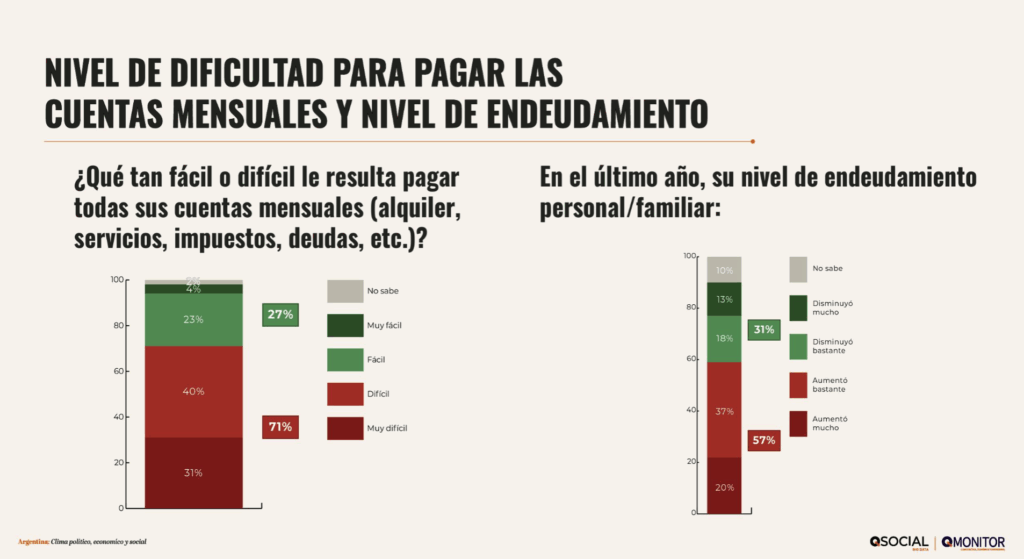 El informe advierte además que el 57% de los encuestados incrementó su nivel de deuda en el último año, principalmente para sostener gastos esenciales como alimentos y servicios. En paralelo, el 69% de los hogares afirma que sus ingresos no alcanzan para cubrir necesidades básicas, mientras que siete de cada diez personas reconocen dificultades para pagar sus cuentas mensuales.
