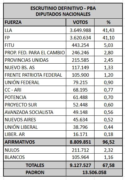 De acuerdo con los datos oficiales, La Libertad Avanza obtuvo 3.649.988 votos (39,99% del total y 41,43% de los positivos), mientras que Fuerza Patria alcanzó 3.620.634 sufragios (39,67% y 41,10%, respectivamente).