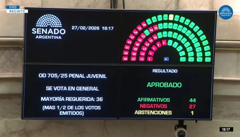 Con 44 votos afirmativos, 27 negativos y una abstención, el Senado convirtió en ley el nuevo Régimen Penal Juvenil. El eje más discutido fue la baja de la edad de imputabilidad de 16 a 14 años.