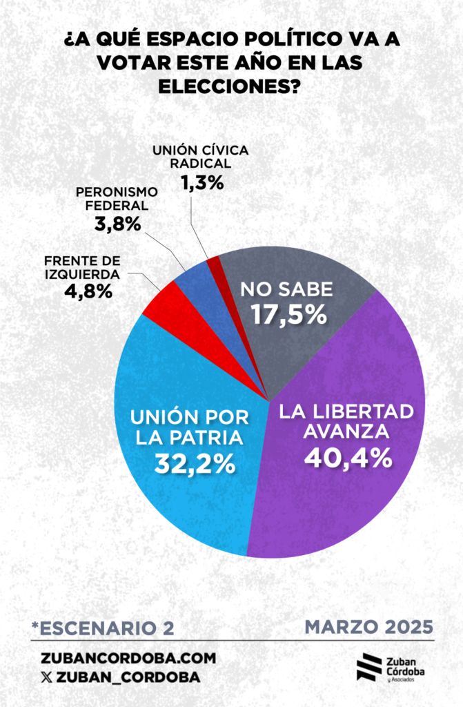 En términos electorales, La Libertad Avanza (LLA) se posiciona como la fuerza con mayor intención de voto, alcanzando un 36,7% en uno de los escenarios planteados. Sin embargo, Unión por la Patria (UP), el espacio peronista, sigue siendo un competidor formidable con un 32,5% de las preferencias. Esta diferencia relativamente estrecha sugiere que el peronismo aún conserva una base sólida, especialmente en regiones históricamente afines y entre sectores vulnerables que ven en este espacio una alternativa frente a las políticas económicas del oficialismo.