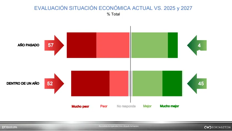 Las expectativas hacia adelante tampoco traen alivio claro: 45% cree que dentro de un año la economía estará mejor, pero 52% piensa que estará peor. Predominan los pronósticos desfavorables, aunque sin un salto respecto de meses anteriores.