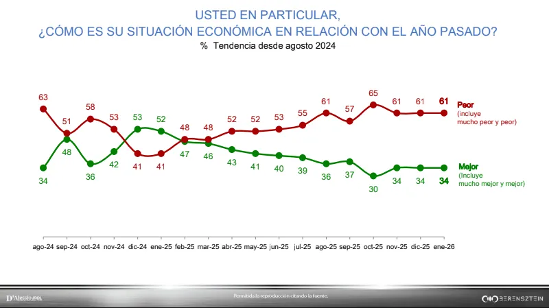 La evaluación se endurece cuando la pregunta se traslada al plano personal. El 61% afirma que su situación económica está peor que la del año pasado, un dato que se repite por tercer mes consecutivo. La percepción de deterioro en el día a día explica buena parte del malhumor que atraviesa a amplios sectores.