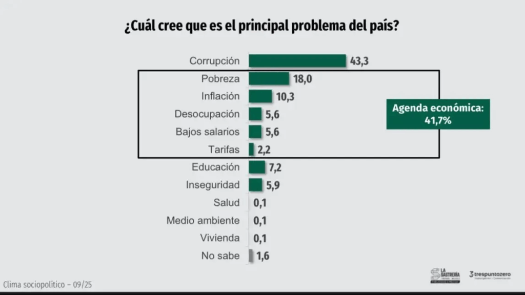 Según un estudio conjunto de las consultoras Trespuntozero y La Sastrería, el 43,3% de los encuestados considera la corrupción como el principal problema nacional, por encima del bloque económico (41,7%), que incluye pobreza, inflación, salarios bajos y desempleo. La tendencia se mantiene en alza desde comienzos del año, cuando estallaron los primeros casos de irregularidades dentro del oficialismo.