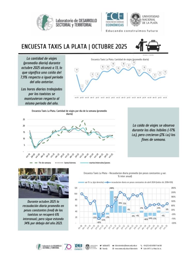 El servicio de taxis en La Plata atraviesa un momento complejo: los viajes diarios cayeron un 7,9% en octubre respecto del año pasado, aunque los fines de semana siguen siendo el principal sostén para los trabajadores del rubro. Así lo reveló un informe del Laboratorio de Desarrollo Sectorial y Territorial de la Facultad de Ciencias Económicas de la UNLP, que analiza periódicamente la evolución del transporte en la ciudad.