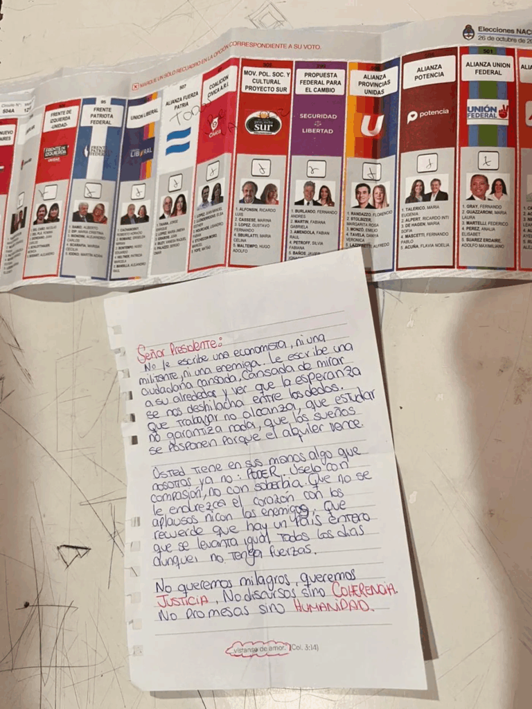 Entre los eventos más llamativos de la jornada, en una escuela de Villa Castells se registró un voto impugnado que incluía una carta dentro de la boleta. Dirigida a Javier Milei, la votante expresaba cansancio ante la situación social y reclamaba justicia, coherencia y humanidad en el ejercicio del poder: