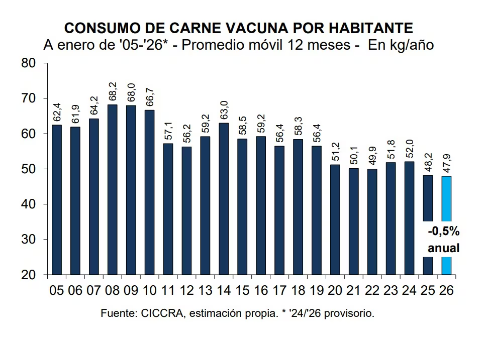 El consumo per cápita anual cayó a mínimos históricos recientes, perforando el piso de las últimas dos décadas. La combinación de menor poder adquisitivo, ajustes tarifarios y recomposición de precios relativos impacta directo en la demanda. La carne, que durante años fue un indicador cultural y económico, hoy se transforma en variable de ajuste del presupuesto familiar.
