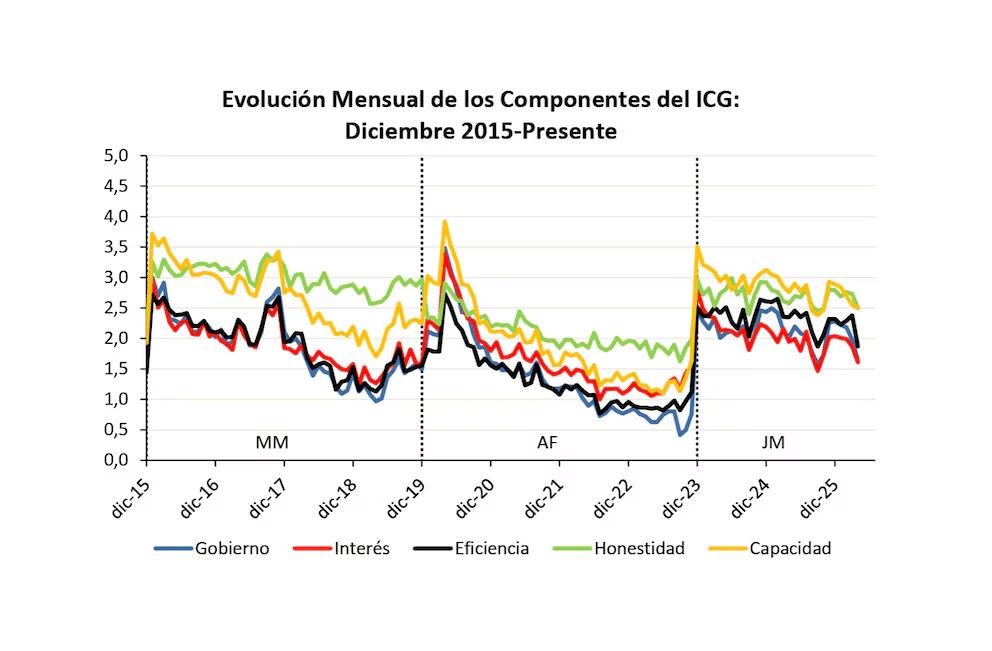El informe de la Di Tella mide dimensiones como evaluación general del Gobierno, eficiencia en la administración del gasto público, honestidad de los funcionarios, capacidad para resolver problemas y preocupación por el interés general. En abril, los distintos componentes mostraron retrocesos, según los relevamientos publicados.