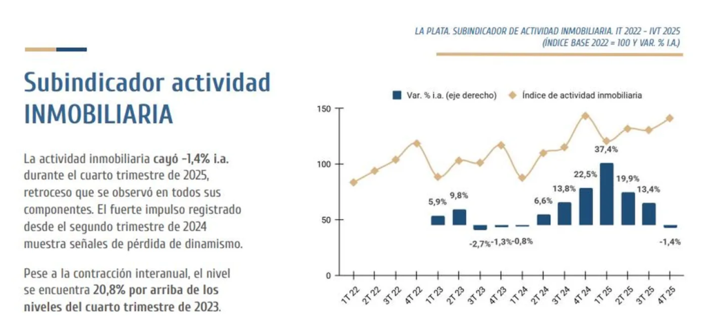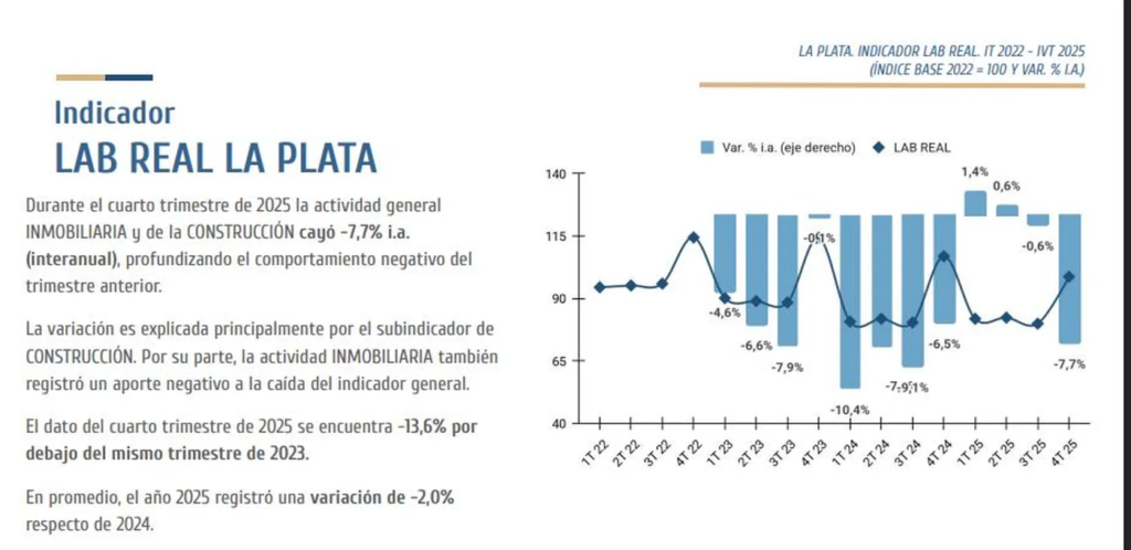 La actividad inmobiliaria y de la construcción en La Plata volvió a mostrar señales de deterioro hacia el cierre de 2025. En el cuarto trimestre, el indicador que releva ambos sectores registró una caída interanual del 7,7%, consolidando una tendencia negativa que ya se venía insinuando durante el año. El nivel de actividad, además, quedó 13,6% por debajo del mismo período de 2023.