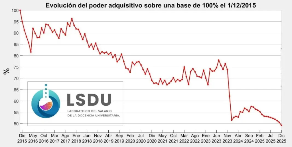 Un informe del Laboratorio del Salario de la Docencia Universitaria (LSDU), elaborado con datos de distintas universidades del país, advirtió que el poder adquisitivo actual se ubica por debajo de cualquier registro de los últimos veinte años.