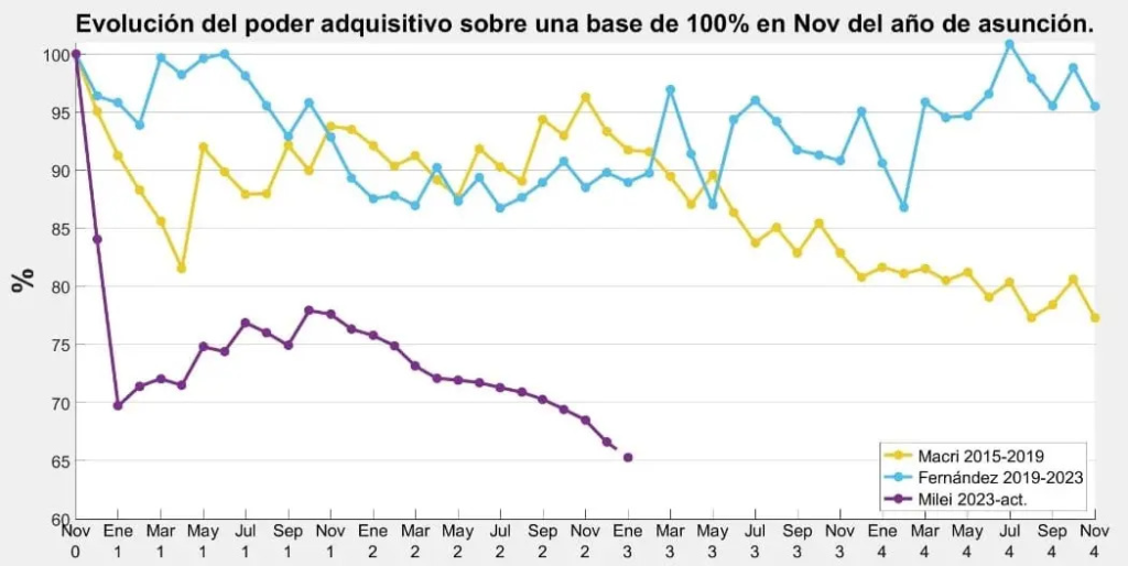 El LSDU remarcó que durante los primeros dos meses de la actual gestión el desplome del poder adquisitivo fue mayor al registrado en los dos gobiernos anteriores. Si bien entre febrero y octubre de 2024 se registró una recomposición parcial, esta fue lenta y discontinua.