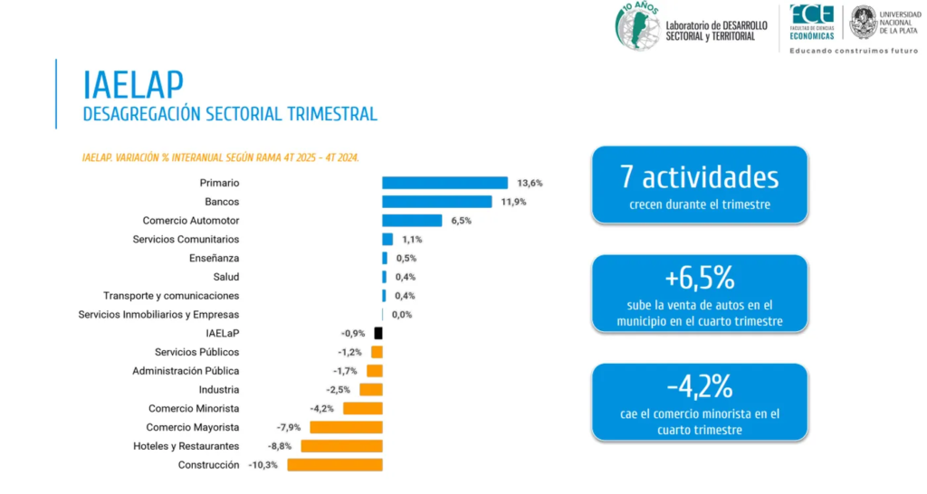 El informe elaborado por la Facultad de Ciencias Económicas de la UNLP advierte que el desempeño positivo del año estuvo concentrado en actividades puntuales. El comercio automotor lideró con una suba del 47,4%, seguido por el dinamismo inmobiliario y el crecimiento del sistema financiero, impulsado por el crédito.