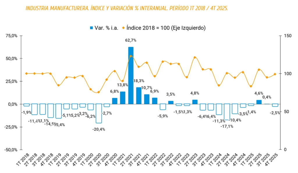 La industria manufacturera, segundo sector en peso dentro de la economía local, apenas creció 0,4% en 2025. Aunque algunos rubros mostraron mejoras —como autopartes, metales e indumentaria—, el repunte no logró sostenerse y en el cuarto trimestre volvió a caer (2,5%).