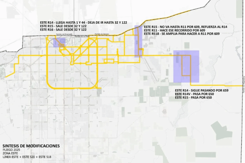 Incluye los servicios de las viejas 520 y 518, y presenta una cobertura “insuficiente” en áreas con expansión urbana. Con los cambios, su recorrido total aumentará un 6%, de 481 a 509 kilómetros. Se suman nuevos tramos en los ramales 11, 14, 15 y 16, con recorridos por calle 650 en Parque Sicardi y combinaciones sobre la Ruta 11 y la 609 para reforzar la conexión con la periferia.