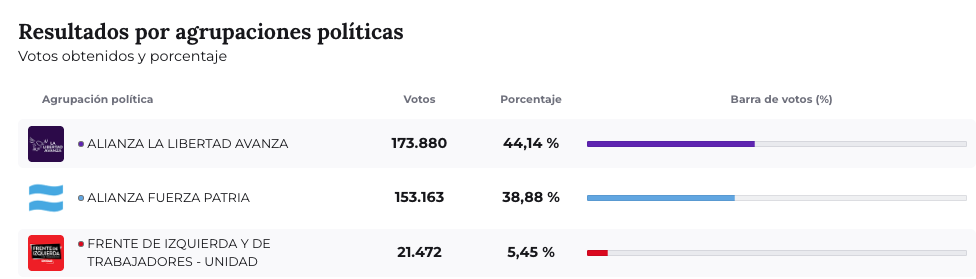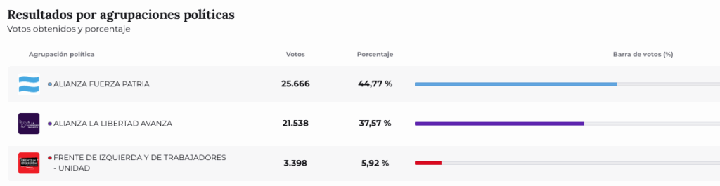 Apenas un mes y medio después del triunfo de septiembre, cuando el peronismo había ganado con más del 43% de los votos, la tendencia se revirtió por completo. La Libertad Avanza creció en más de 30 mil votos, mientras el oficialismo local perdió cerca de 20 mil.