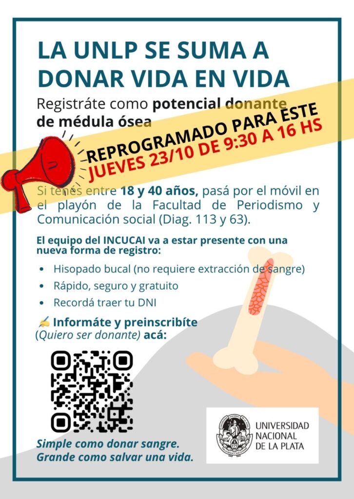 La Universidad Nacional de La Plata (UNLP) se sumó a la campaña “Donar Vida en Vida”, invitando a los platenses a registrarse como potenciales donantes de médula ósea. La iniciativa, organizada en conjunto con el INCUCAI, busca facilitar el acceso al registro a través de un procedimiento rápido, seguro y gratuito.
