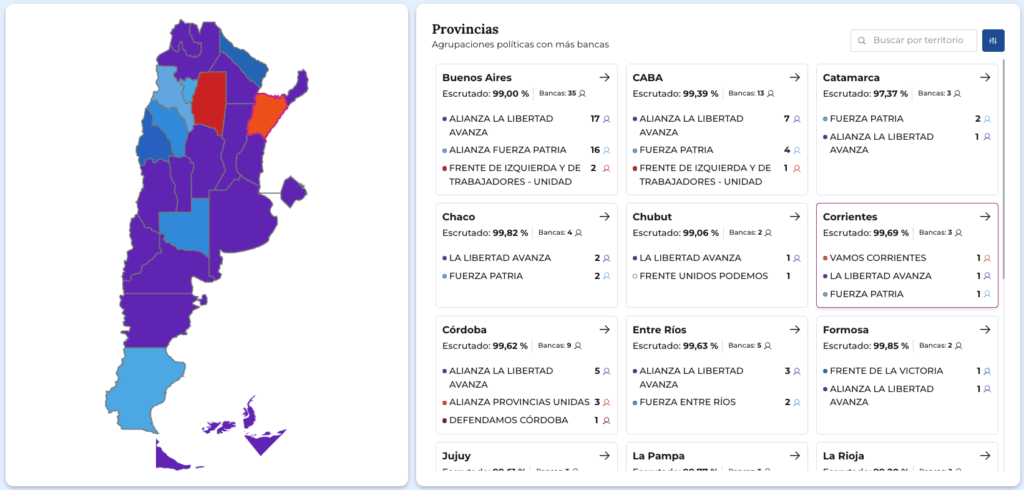 La Libertad Avanza se impuso con claridad en Buenos Aires —donde Diego Santilli dio el golpe al vencer por casi diez puntos al peronismo— y consolidó su dominio en CABA, Córdoba, Santa Fe, Mendoza y Entre Ríos, entre otros distritos clave.