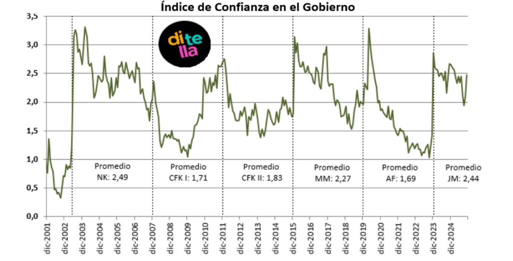 Pese a la mejora, la confianza general continúa 7,3% por debajo del nivel registrado en noviembre de 2024 y lejos de los picos que tuvo Mauricio Macri en 2017. Aun así, supera lo que medía la gestión de Alberto Fernández en el mismo período de 2021.