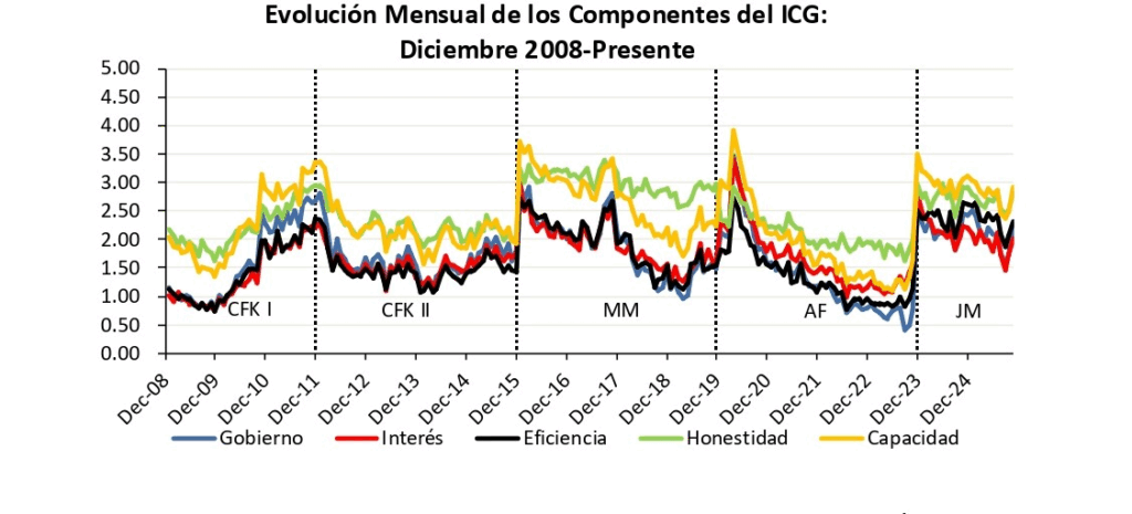 El relevamiento tomó más de mil casos entre el 3 y el 13 de noviembre, es decir, con el oficialismo todavía celebrando el resultado electoral. Todos los componentes del índice —interés, eficiencia, honestidad, capacidad y evaluación general del gobierno— mostraron una evolución positiva.