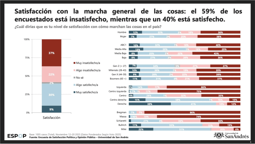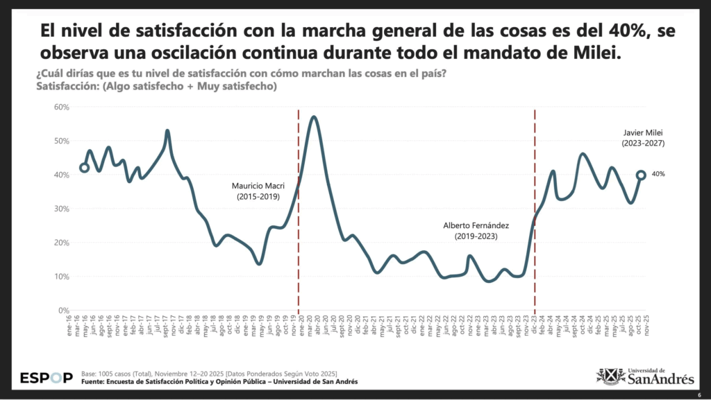 El informe 48.ESPOP, difundido durante el fin de semana extralargo, complementa el cuadro con una radiografía del clima político. La satisfacción general con el rumbo del país se mantiene estable en torno al 40%, mientras que el 59% sigue manifestando insatisfacción. El Presidente mejora su nivel de aprobación, que trepó al 45% —seis puntos más que en septiembre— aunque aún por debajo de los números que tenía Macri hacia la mitad de su mandato.