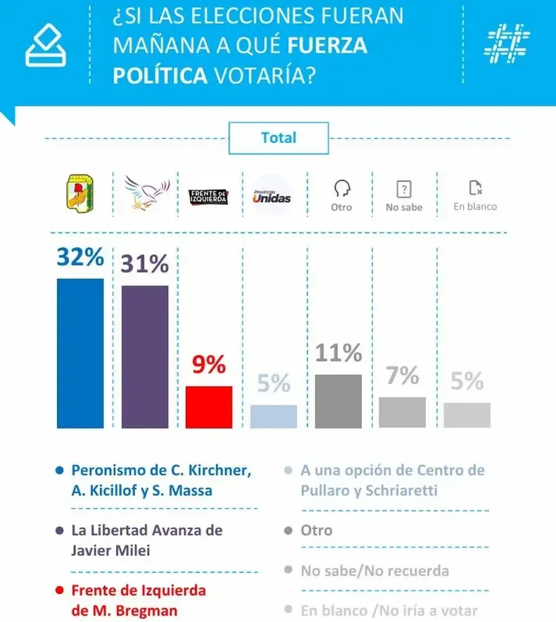 El otro dato que encendió alarmas es electoral. El peronismo alcanza 32% de intención de voto contra 31% de La Libertad Avanza.