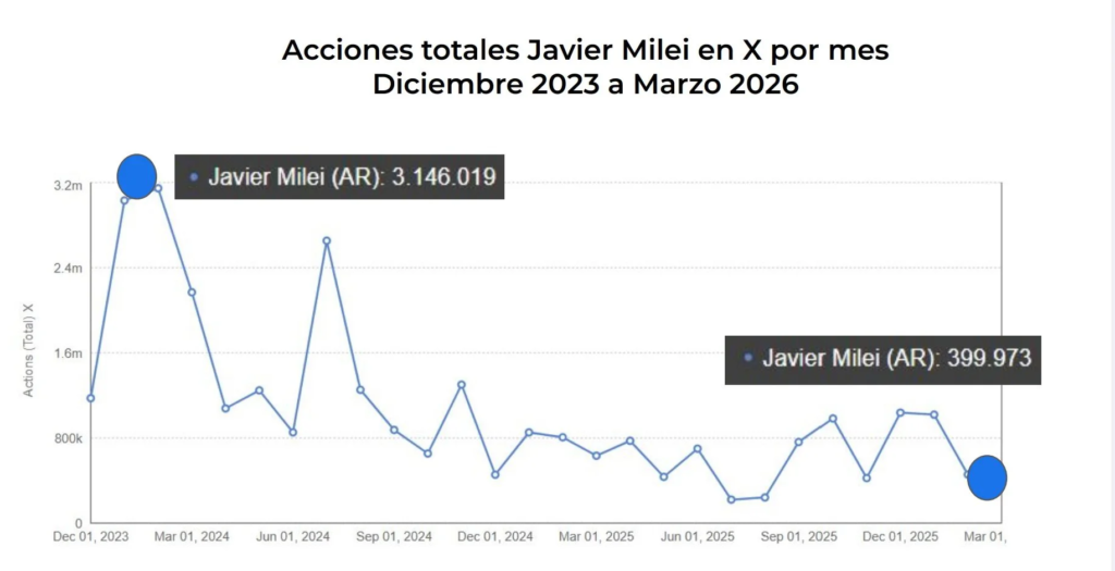 Según QSocial Big Data, la “vitalidad digital” de Milei en X cayó un 87% en 27 meses: pasó de 3,1 millones de interacciones mensuales en diciembre de 2023 a apenas 400.000 en marzo de 2026.