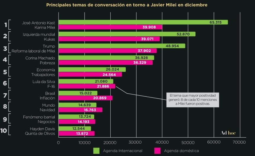 En apenas un día, el Presidente acumuló cerca del 10% del total de menciones que había reunido en todo diciembre. La agenda internacional, según Ad Hoc, genera para Milei niveles de aprobación sensiblemente más altos que los temas domésticos, en especial aquellos vinculados a la economía, la reforma laboral o el ajuste fiscal.
