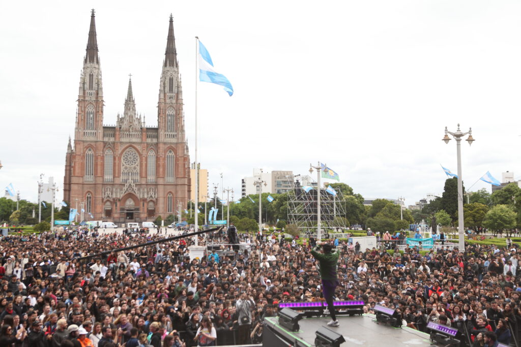 A medida que avanzan las primeras presentaciones, la plaza central de la ciudad se va colmando con familias, grupos de amigos, jóvenes y vecinos que se acomodan alrededor del escenario principal.