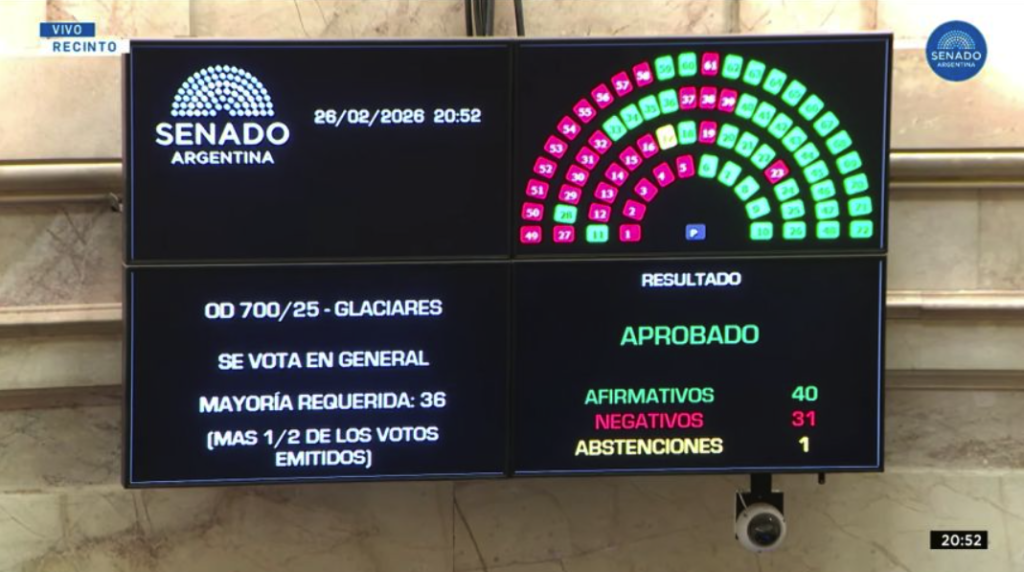 El Senado de la Nación aprobó este jueves la reforma de la Ley de Glaciares y le dio media sanción a uno de los proyectos más sensibles de la agenda económica del Gobierno. La votación cerró con 40 votos a favor, 31 en contra y una abstención. El texto ahora deberá ser tratado por la Cámara de Diputados cuando se inicie el período ordinario.