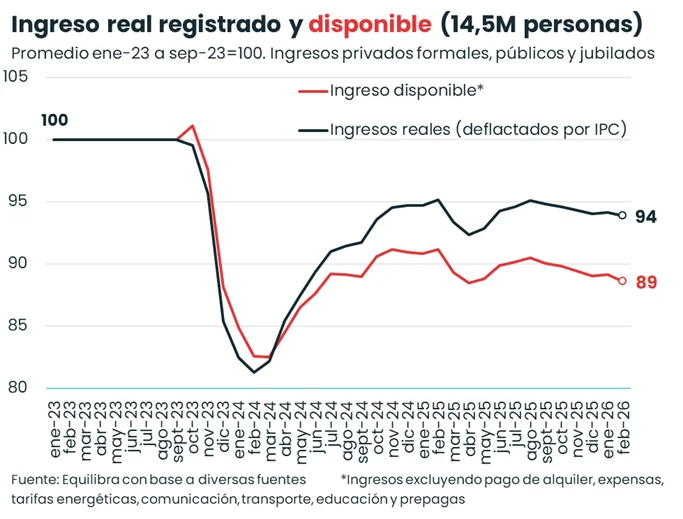Los ingresos crecieron 2,4% en febrero y quedaron otra vez por debajo del IPC (2,9%). El deterioro ya es tendencia, golpea más al empleo registrado y empieza a tensionar consumo, deuda y actividad.