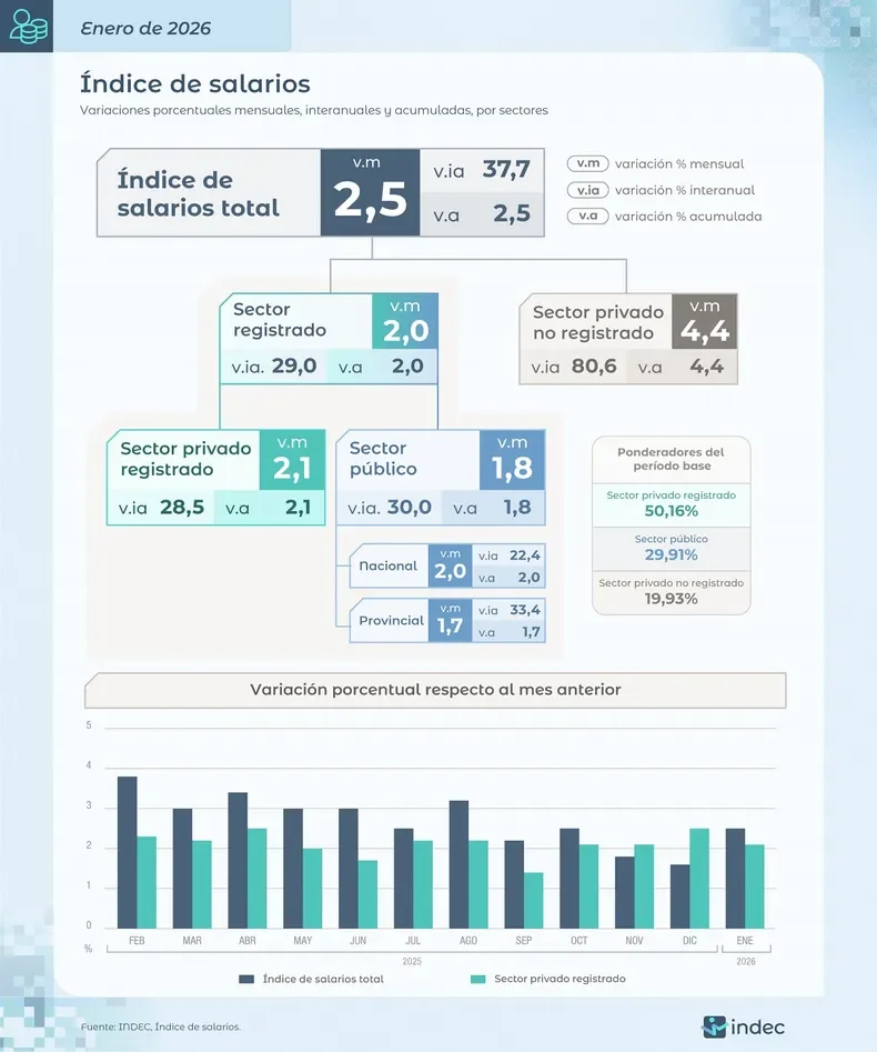 El informe oficial muestra que dentro del segmento registrado —que incluye tanto al empleo privado formal como al estatal— los aumentos quedaron lejos de compensar la inflación. Mientras los salarios privados registrados subieron un 2,1%, los del sector público quedaron aún más atrás.