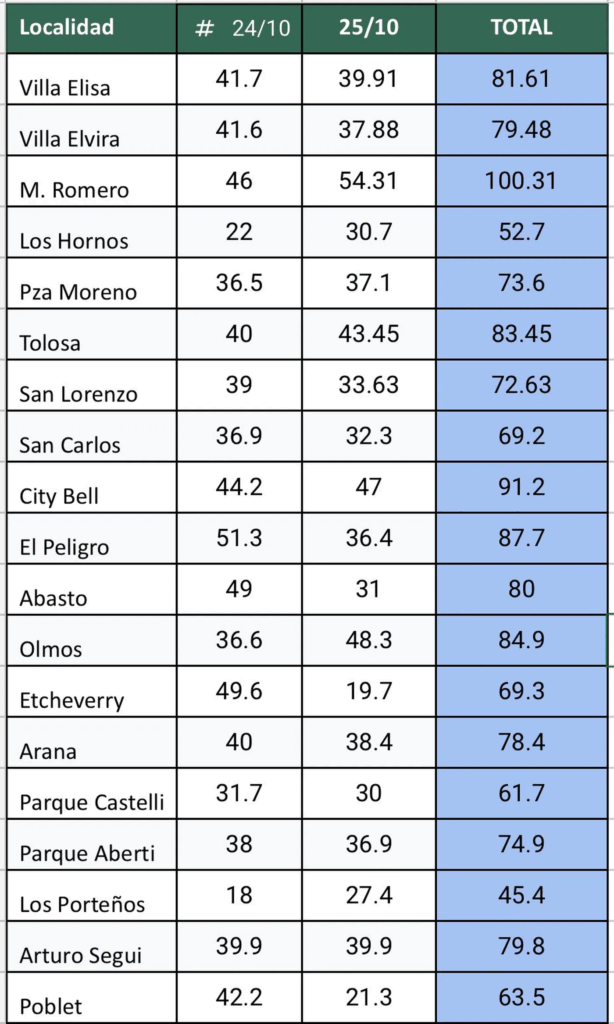 El relevamiento oficial, que contabiliza las precipitaciones entre el 24 y el 25 de octubre, indicó que Melchor Romero fue la zona más afectada, con 100,31 milímetros, de los cuales 54,31 se registraron solo en las primeras horas del sábado.