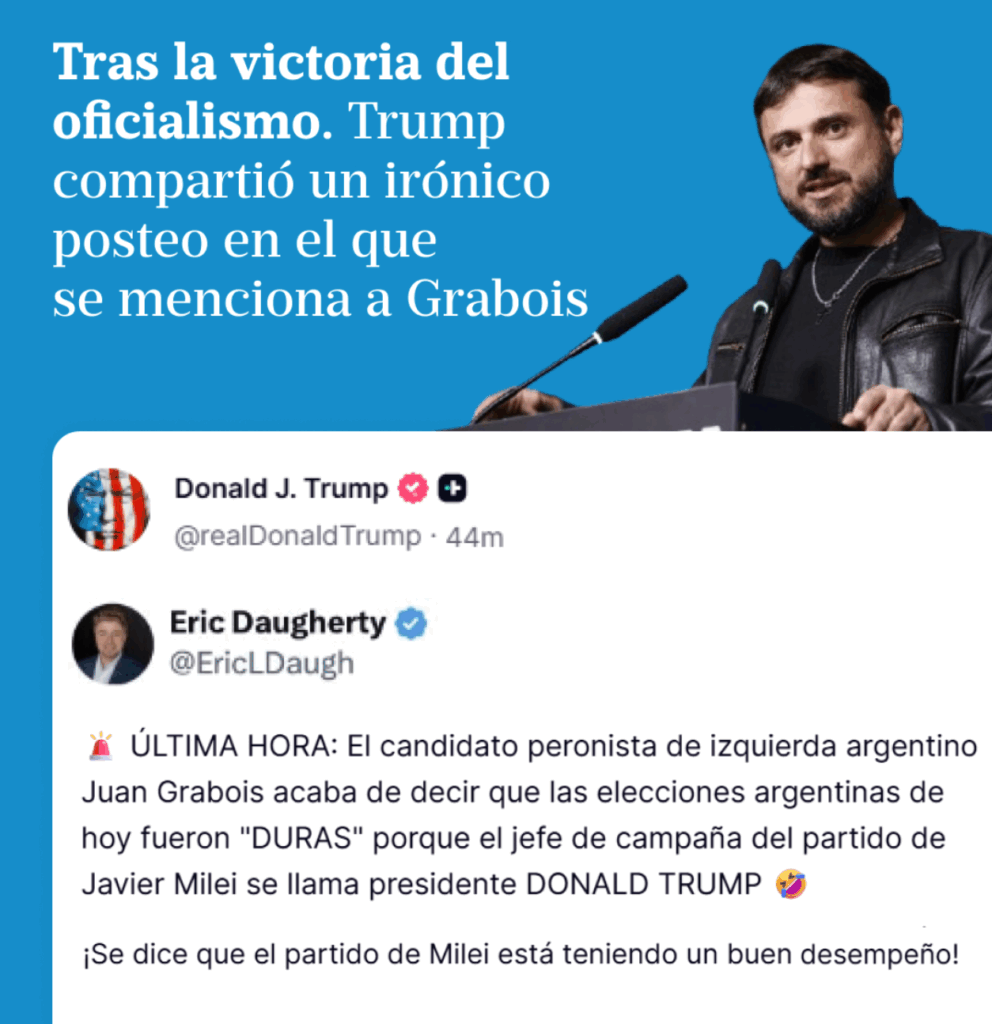 Eric Daugherty, subdirector de noticias del medio conservador Florida’s Voice, replicó el fragmento en tono sarcástico: “El candidato peronista de izquierda argentino, Juan Grabois, acaba de afirmar que las elecciones argentinas de hoy fueron ‘duras’ porque el jefe de campaña del partido de Javier Milei es el presidente Donald Trump”. El posteo fue compartido por el propio Trump, amplificando la burla y posicionando a Grabois como antagonista involuntario en el relato digital republicano.